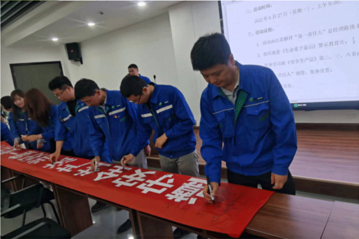 麒祥新材料全體員工紛紛在“遵守安全生產(chǎn)法 當(dāng)好責(zé)任人”的安全生產(chǎn)月活動(dòng)主題橫幅上鄭重簽名,莊嚴(yán)宣誓承諾。