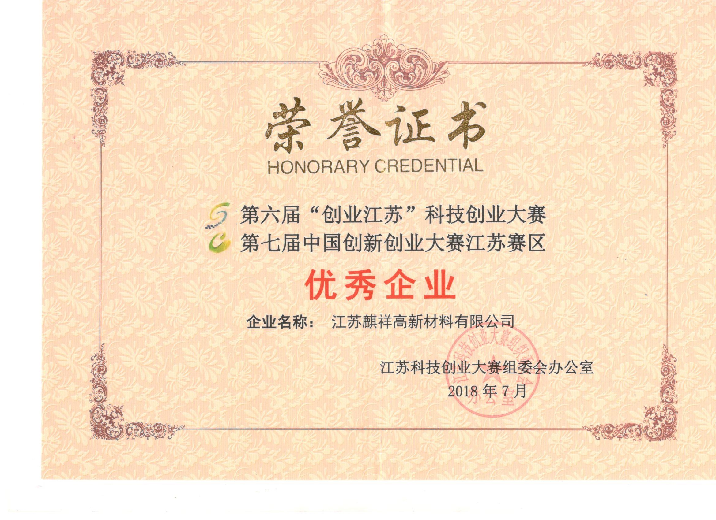江蘇麒祥榮獲全國創(chuàng)新創(chuàng)業(yè)大賽(新材料行業(yè)決賽)成長組 “優(yōu)秀企業(yè)”獎