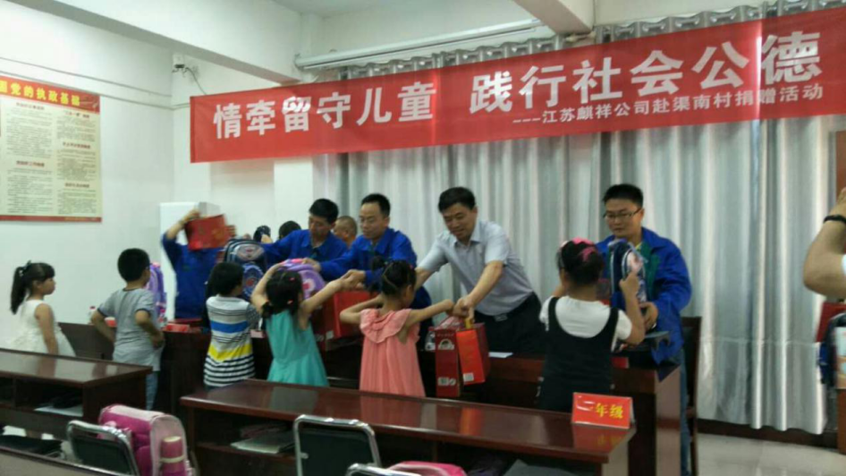 為落實“兩學一做”學習教育常態(tài)化,發(fā)揮支部作用,奉獻黨員愛心,5月26下午,江蘇麒祥新材料有限公司總經(jīng)理兼黨支部書記彭華龍同志帶領公司5名黨員員工來到蘇淮高新區(qū)淮洪路辦事處渠南村,開展“情牽留守兒童,踐行社會公德”主題活動,對該村33名留守兒童進行集中慰問,為每位學生送去拉桿書包、課外書籍,以及粽子、鴨蛋等端午大禮包。