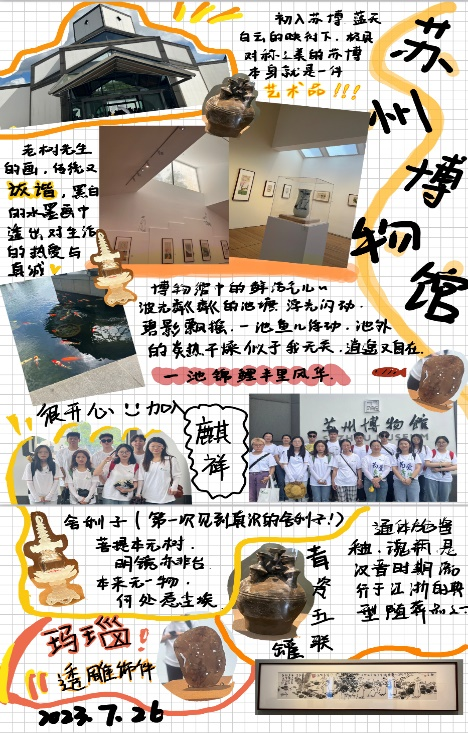 在專業(yè)知識(shí)熟練運(yùn)用的同時(shí),要補(bǔ)全“短板”,德、智、體、美、勞全面發(fā)展,為公司事業(yè)的蓬勃發(fā)展貢獻(xiàn)自己的智慧和力量。培訓(xùn)營(yíng)的第三天,為了提高新人的美學(xué)修養(yǎng),公司新人一同參觀了蘇州博物館并制作了自己的美學(xué)報(bào)告,報(bào)告形式多樣,展示了新人對(duì)蘇博的見解。