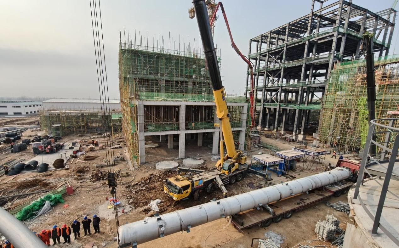清晨,朝陽冉冉升起,照耀著繁忙的工地,3臺巨大的反應主體設備陸續(xù)進入安裝現(xiàn)場,工人們正在進行緊張的吊裝作業(yè)。